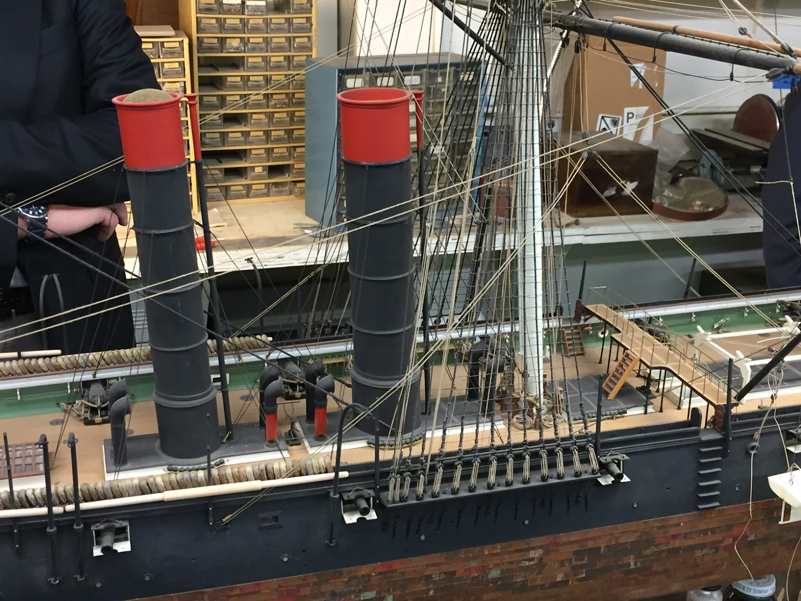 This model of the Wampanoag shows how difficult it was to combine steam propulsion with wind sails. It's not hard to imagine why seasoned sailors and officers in the sailing Navy detested the funnels and machinery required to also give their vessels steam power. This photo was taken by naval fiction writer Bill White in November 2015 while visiting the Naval Surface Warfare Center in Carderock, MD. The model was being carefully restored from her original plans, by the NSWC model shop. The Navy commissions a model of every class of vessel built. Many models remain in Carderock, but models are also "loaned" to museums all over the USA, as well as the Naval Academy in Annapolis. Source: http://maritimemaunder.blogspot.com/2015/11/naval-historical-foundation.html.